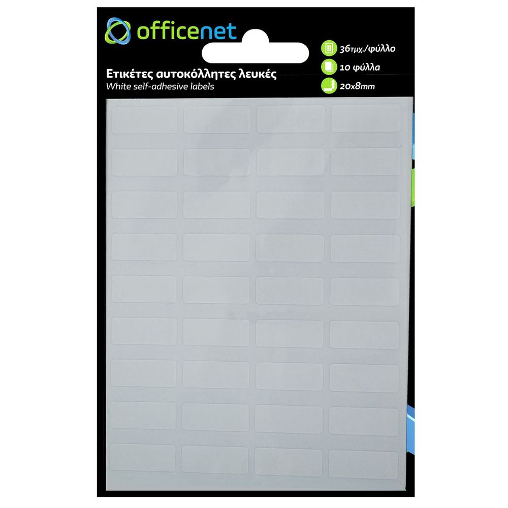 Αυτοκόλλητες λευκές ετικέτες της Officenet με διαστάσεις 20x8mm. Το σετ περιλαμβάνει 10 φύλλα με 36 ετικέτες το καθένα. Ιδανικές για οργάνωση και σήμανση στο γραφείο ή το σπίτι.