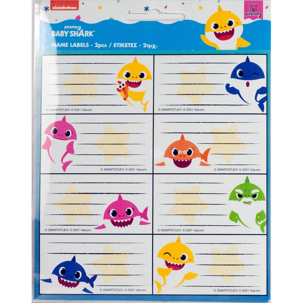 Αυτοκόλλητες ετικέτες διπλής όψης με τον αγαπημένο σου ήρωα Baby Shark. Το σετ περιλαμβάνει 16 έγχρωμες ετικέτες διαστάσεων 14 x 20 cm, ιδανικές για να διακοσμήσεις τα τετράδια και τα βιβλία σου με τον πιο διασκεδαστικό τρόπο.