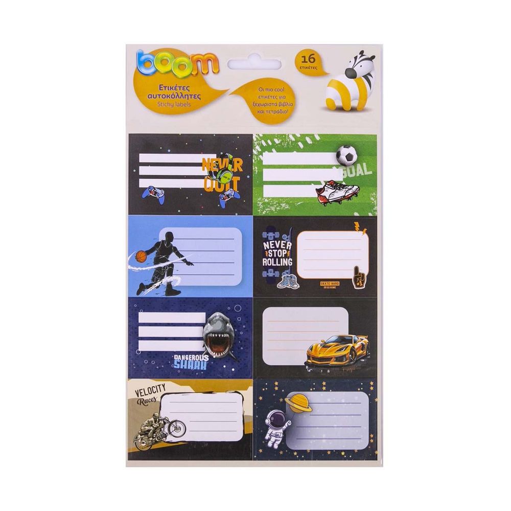 Ετικέτες αυτοκόλλητες Boom Αction World σε συσκευασία 16 τεμαχίων. Οι πιο cool ετικέτες ιδανικές για ξεχωριστά βιβλία και τετράδια.