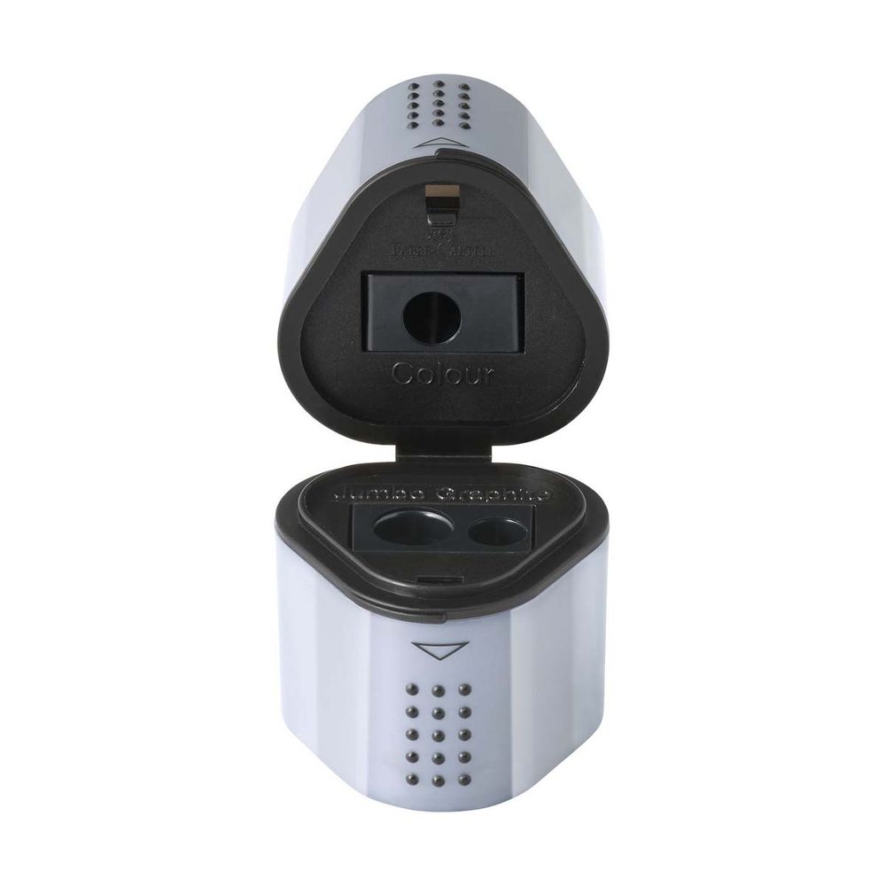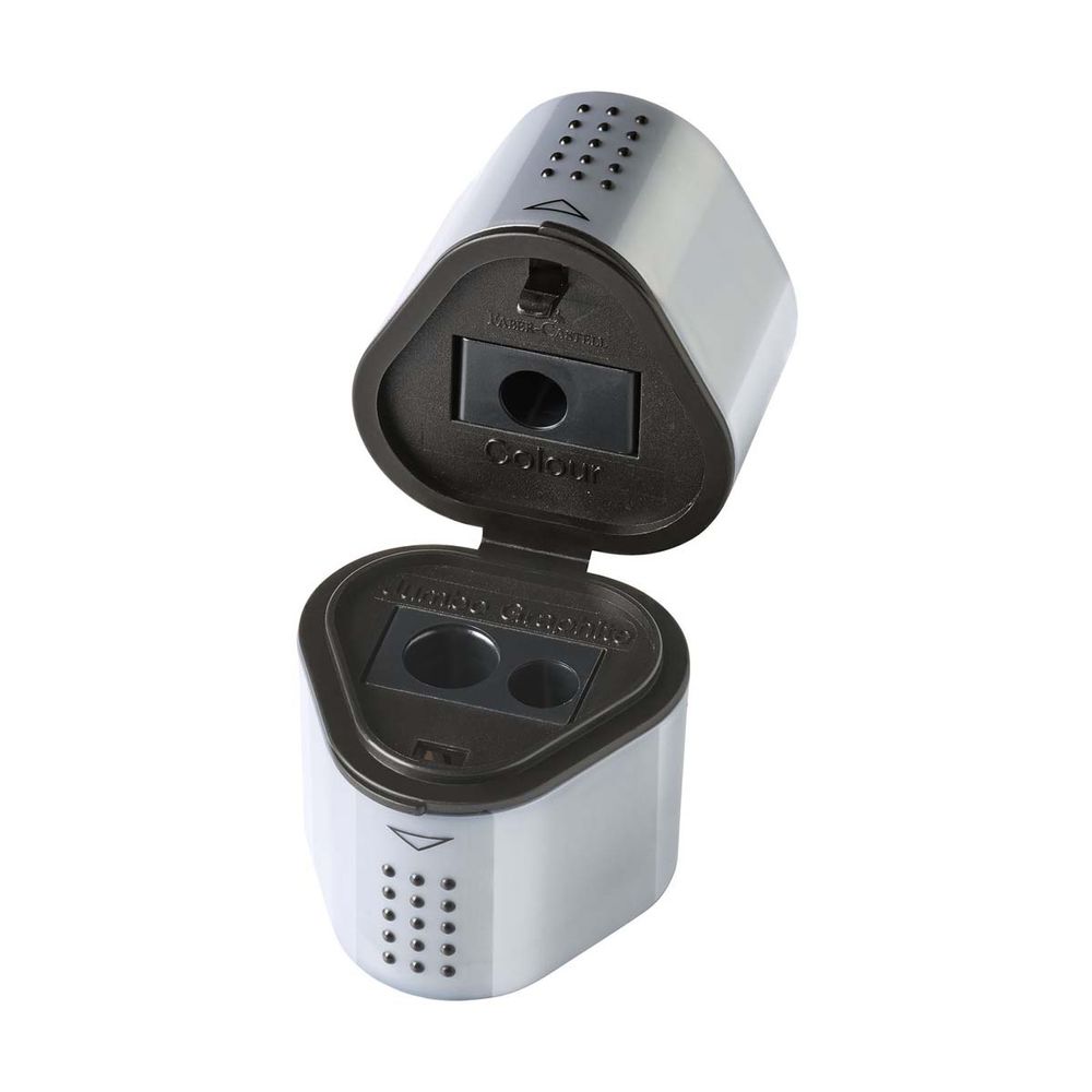 H ξύστρα Faber Castell με 3 υποδοχές και διπλό αποθηκευτικό χώρο είναι κατάλληλη για όλα τα μολύβια με κανονική ή μεγάλη διάμετρο. Διαθέτει ειδική υποδοχή για ξυλομπογιές.