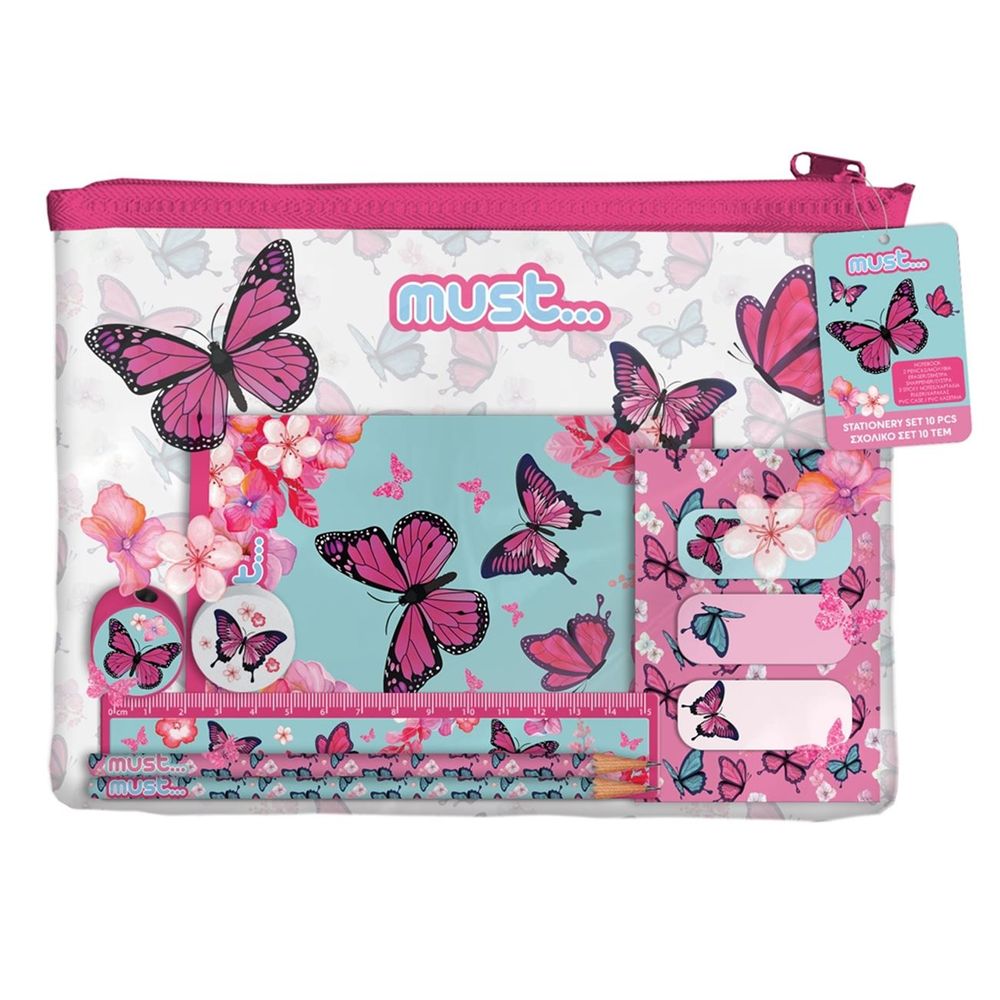 Το Must Butterfly Σχολικό Σετ με Κομπιουτεράκι και Κασετινάκι Pvc διαθέτει όλη την απαραίτητη γραφική ύλη και όχι μόνο, που χρειάζεται κάθε μαθητής για τη σχολική χρονιά. Περιλαμβάνει: Τετράδιο, Χάρακας, 2 Μολύβια, Γόμα, Ξύστρα, 3 Αυτοκόλλητα Χαρτάκια, Pvc Κασετίνα.