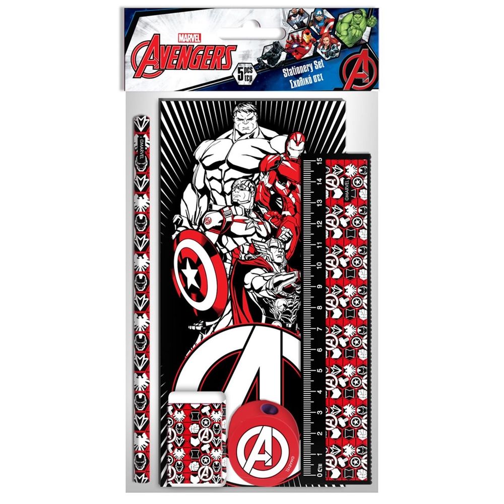 Το Σχολικό Σετ Avengers 5 τεμαχίων, είναι ιδανικό για τον μαθητή που δεν αποχωρίζοται τους αγαπημένους παιδικούς ήρωες του ακόμα και μέσα στην τάξη. Περιλαμβάνει: Μολύβι, Γόμα, Ξύστρα, Χάρακα 15 εκ. και Σημειωματάριο 20 φύλλων σε διαστάσεις 9 x 18.5 εκ.