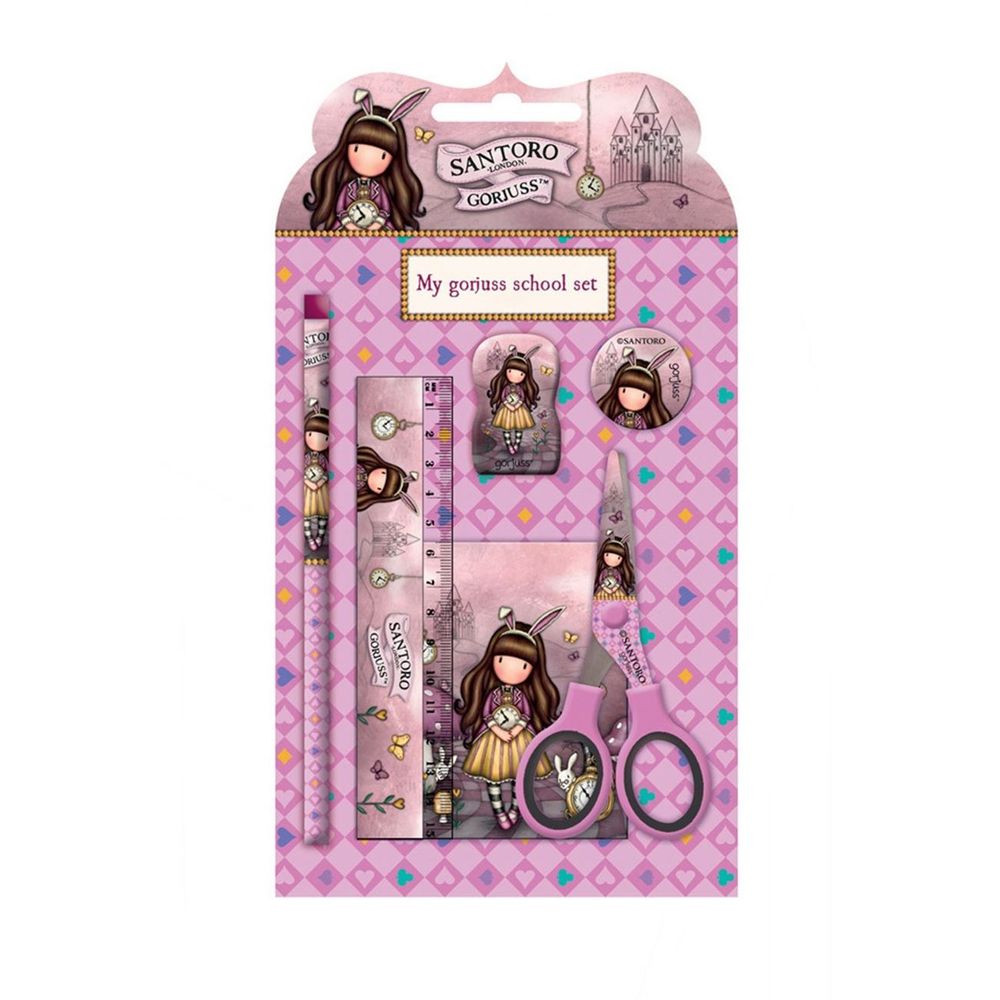 Σχολικό σετ Gorjuss Santoro που περιλαμβάνει χάρακα, μολύβι, γόμα, μπλοκάκι, ψαλίδι και ξύστρα.