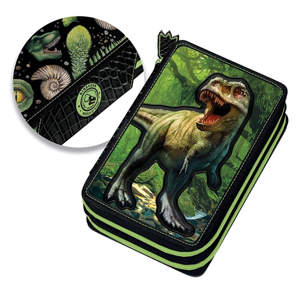 Διπλή κασετίνα με 2 θήκες και μοντέρνο σχέδιο Dinosaur, που περιέχει στυλό, μολύβια, γόμα, ξύστρα, χάρακα, ξυλομπογιές και μαρκαδόρους.