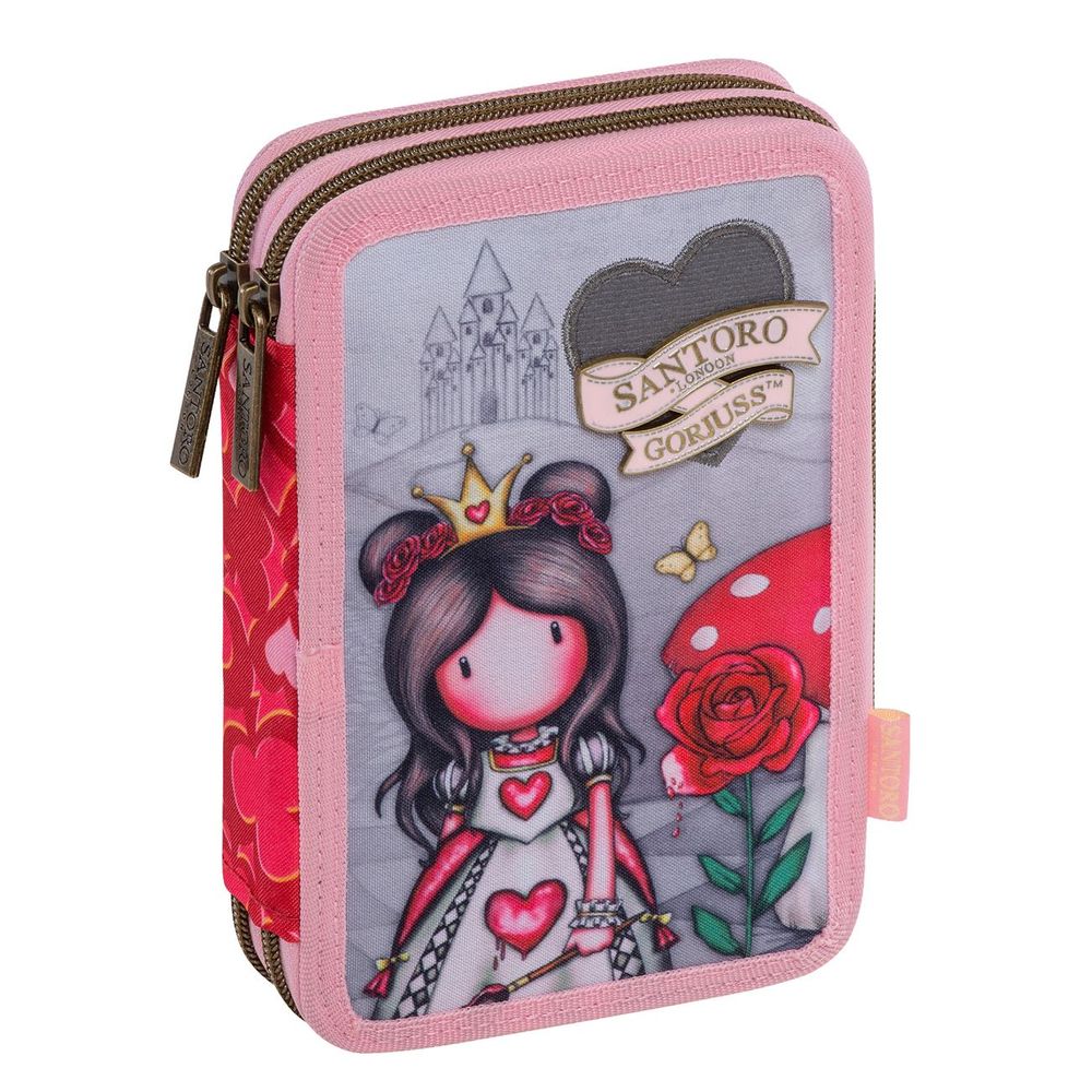 Διπλή κασετίνα που περιέχει χάρακα, 5 μολύβια, στυλό, γόμα, ξύστρα, 10 μαρκαδόρους και 10 ξυλομπογιές. Διαθέτει μεταλλικό σκαλιστό λογότυπο και φερμουάρ με σκαλιστό Santoro λογότυπο.