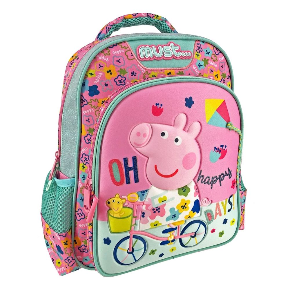 Η Σχολική Τσάντα Πλάτης Νηπίου Peppa Pig Happy Days Must διαθέτει 2 ευρύχωρες θήκες για τα βιβλία, τα τετράδια, την κασετίνα και όλα τα απαραίτητα είδη γραφής για το σχολείο. Επιπλέον διαθέτει, πλαϊνή θήκη για παγούρι με ανθεκτικό δίχτυ, Ενισχυμένη λαβή για άνετο κράτημα, ανθεκτικά φερμουάρ, ετικέτα στοιχείων και μπρελόκ.