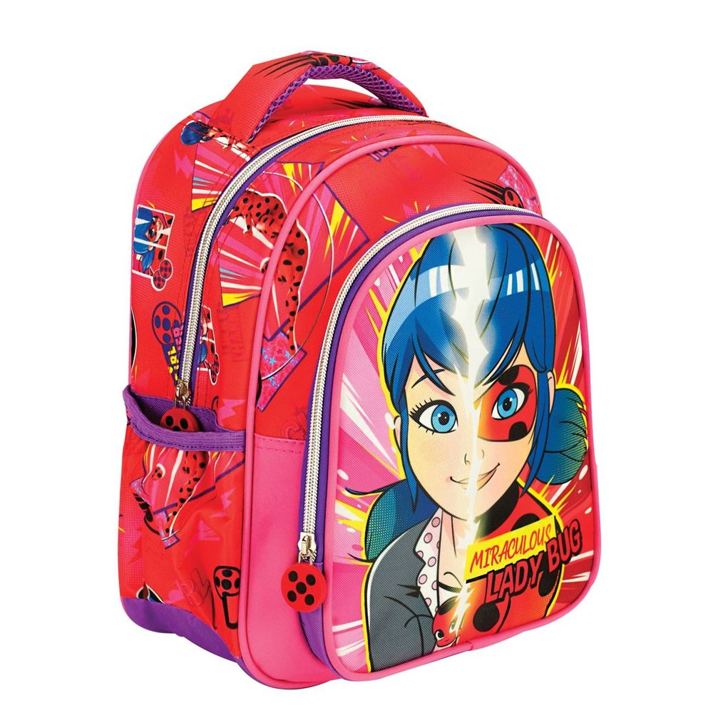 Η τσάντα πλάτης νηπίου Ladybug Girl Power της εταιρίας Gim διαθέτει μια κεντρική θέση, μία επιπλέον μπροστινή και πλαϊνές θήκες για παγούρια. Επιπλέον αποτελείται από ενισχυμένους ιμάντες πλάτης, καθώς και ενισχυμένη λαβή χειρός.