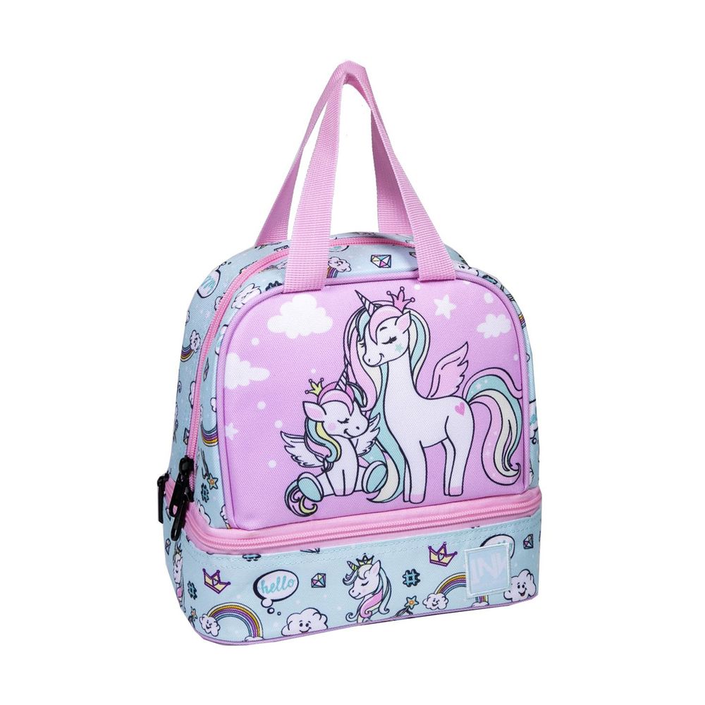 Τσαντάκι φαγητού με ισοθερμική επένδυση και διπλό φερμουάρ στις δύο θήκες. Διαθέτει μία μεγάλη θήκη ευρύχωρη για το κολατσιό του παιδιού και μια θήκη στο κάτω μέρος της τσάντας για τοποθέτηση χαρτοπετσέτας και χυμού. Με ενσωματωμένη διπλή λαβή για το χέρι.