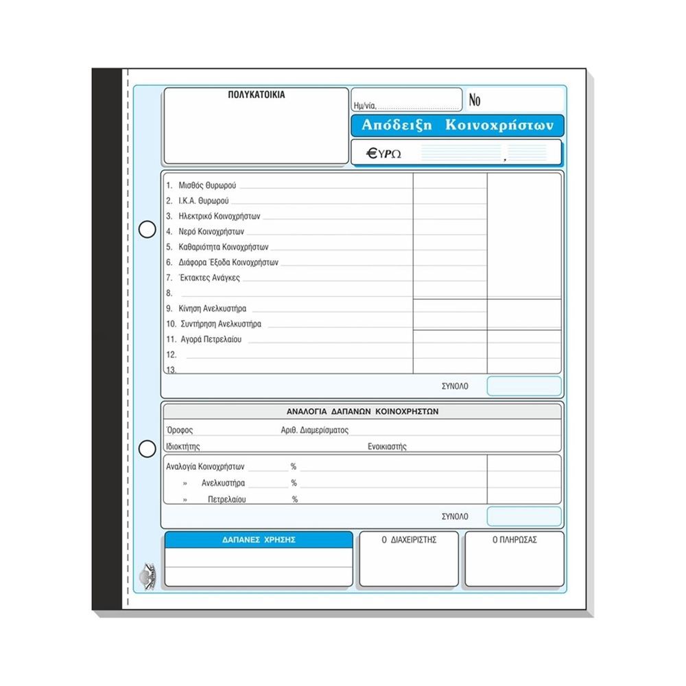 Διπλότυπο μπλοκ απόδειξης κοινοχρήστων με διαστάσεις 19x20 εκατοστά. Κατάλληλο για την καταγραφή και παρακολούθηση των κοινόχρηστων δαπανών πολυκατοικίας. Περιέχει 50 σετ διπλότυπων φύλλων σε λευκό και κίτρινο χρώμα.