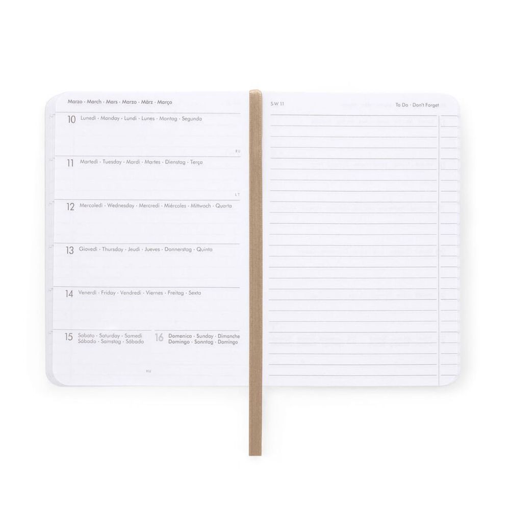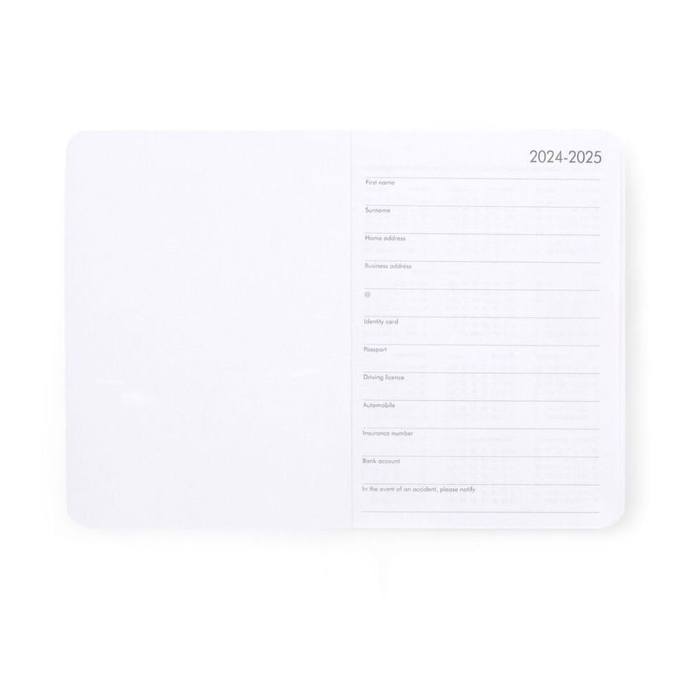 Το ημερήσιο ημερολόγιο 2025 Travel (9.5x13.5 cm) διαθέτει 360 σελίδες λευκού χαρτιού με περφορέ γωνίες. Είναι γραμμένο σε 6 γλώσσες (Αγγλικά, Ιταλικά, Γαλλικά, Ισπανικά, Γερμανικά, Πορτογαλικά) και περιλαμβάνει 24 σελίδες για μηνιαίο πλάνο, 2 για κάθε μήνα και ενσωματωμένο φάκελο για αποθήκευση εγγράφων.