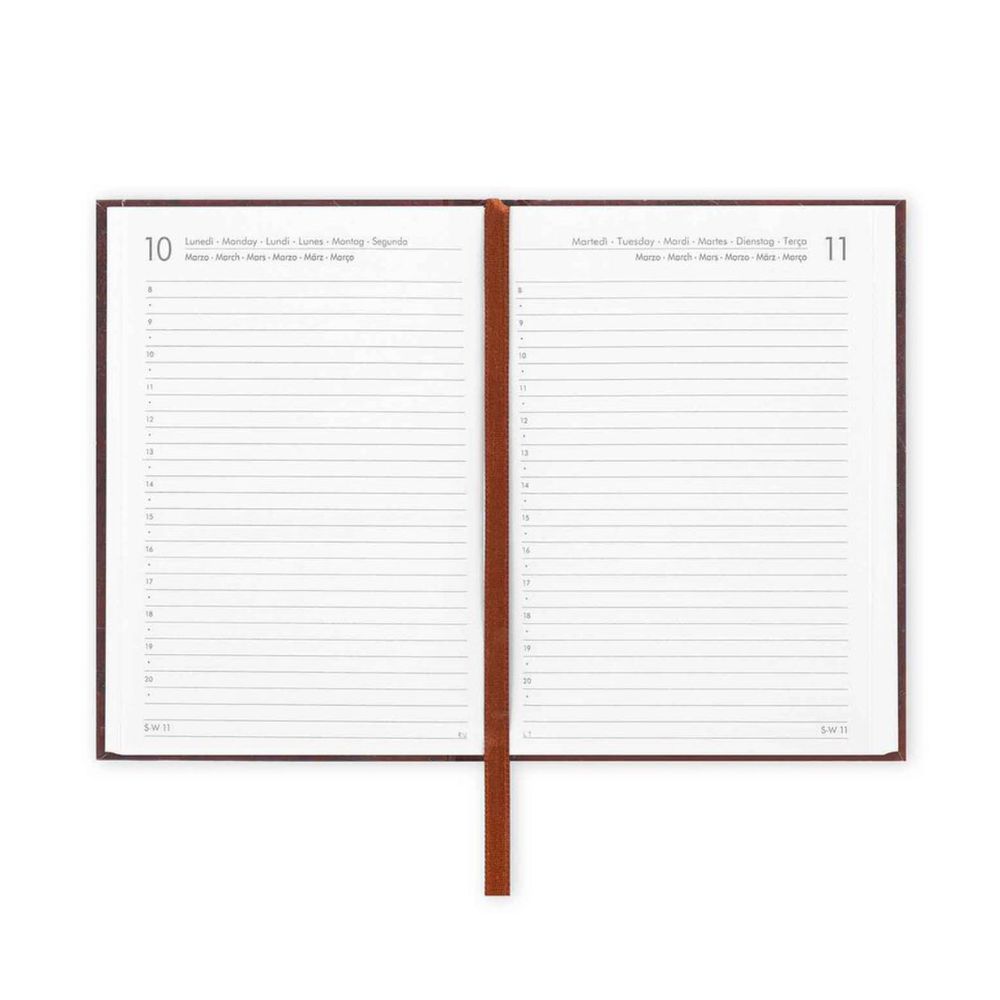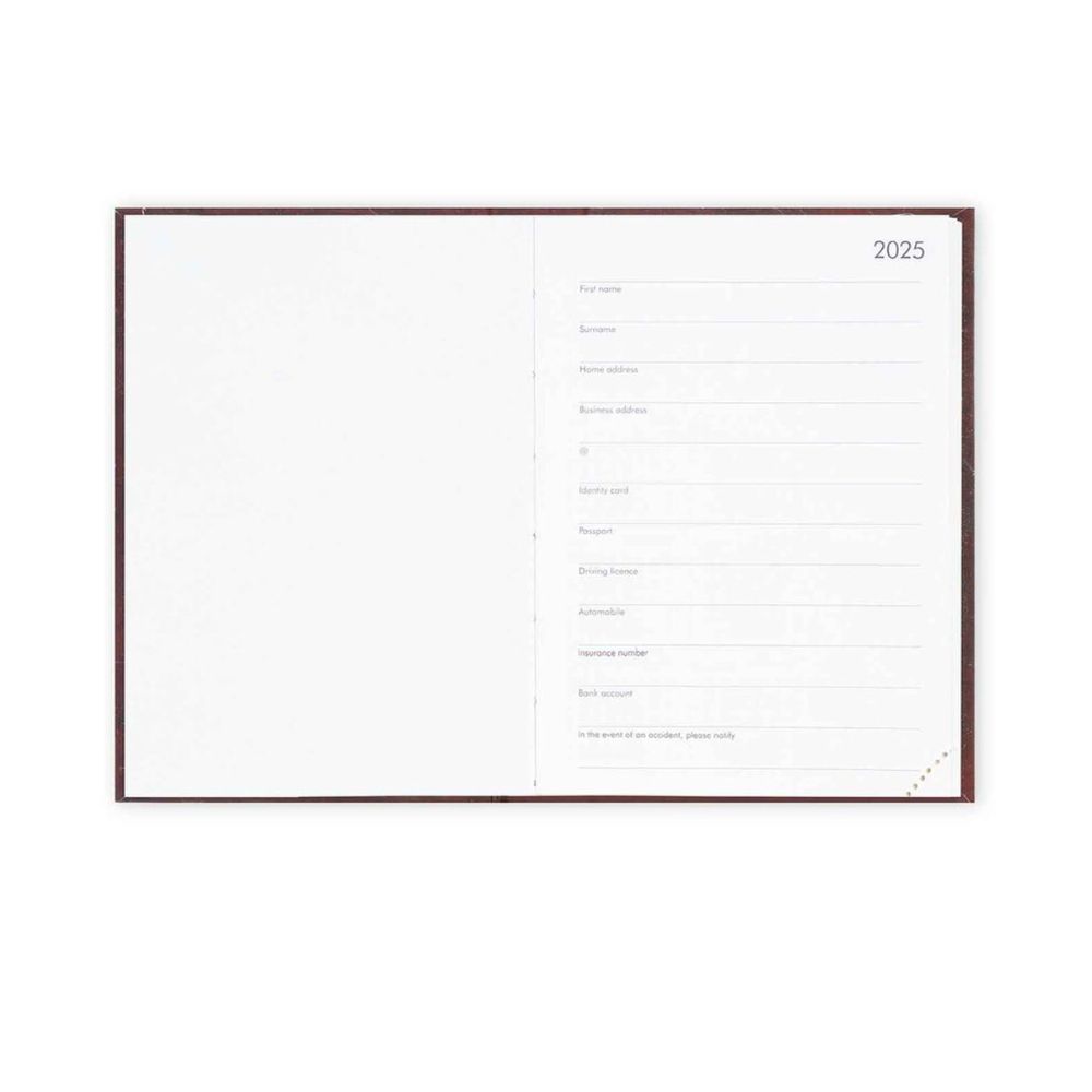 Το ημερήσιο ημερολόγιο 2025 Vintage Book (9.5x13.5 cm) διαθέτει 360 σελίδες λευκού χαρτιού με περφορέ γωνίες. Είναι γραμμένο σε 6 γλώσσες (Αγγλικά, Ιταλικά, Γαλλικά, Ισπανικά, Γερμανικά, Πορτογαλικά) και περιλαμβάνει 24 σελίδες για μηνιαίο πλάνο, 2 για κάθε μήνα και ενσωματωμένο φάκελο για αποθήκευση εγγράφων.