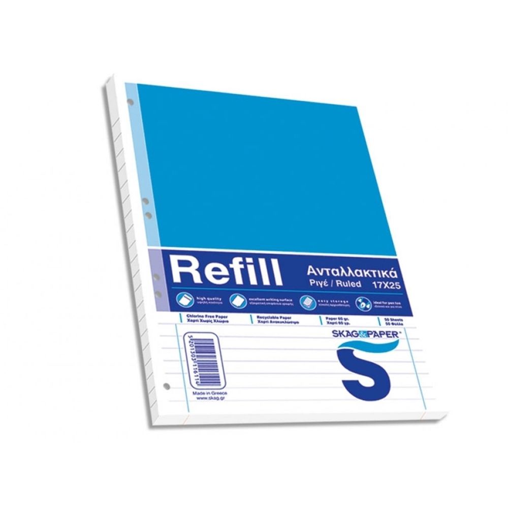 Ανταλλακτικά φύλλα κρικ 17x25 εκατοστών με ριγέ γράμμωση. Περιέχει 50 λευκά φύλλα υψηλής ποιότητας από την Skag, ιδανικά για τις καθημερινές σου σημειώσεις. Ανακάλυψε την άψογη γραφή σε κάθε σελίδα.